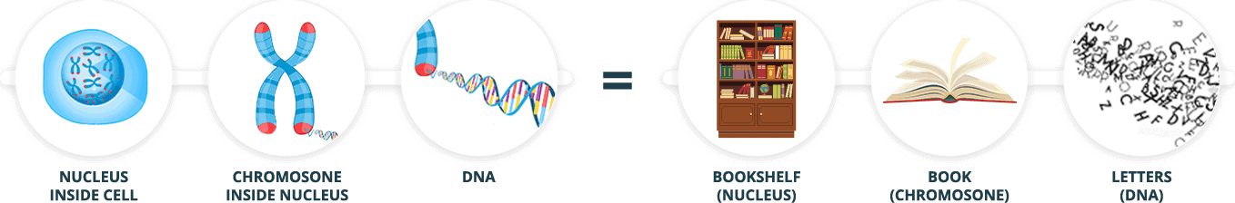 Let’s compare this to a library: you have a bookshelf (nucleus), containing 46 books (chromosomes). In these books sentences (genes) are written with letters (DNA). Normally these books are tightly packed on the bookshelf. Imagine that by accident (sporadic) the book is damaged (pages are torn, letters are missing, …).
