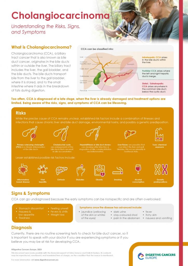 Patient-oriented, 1-page infographic, developed in collaboration with The Cholangiocarcinoma Charity AMMF.